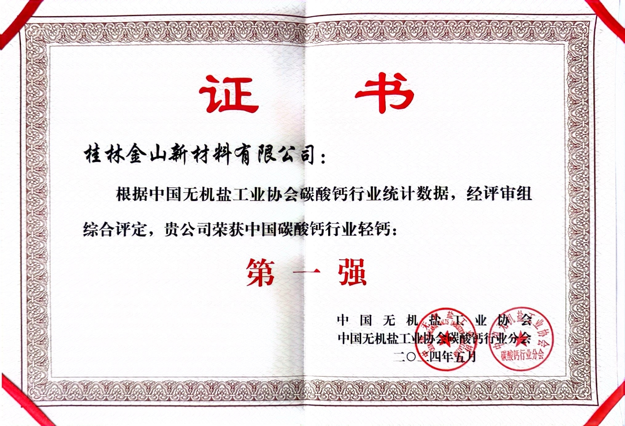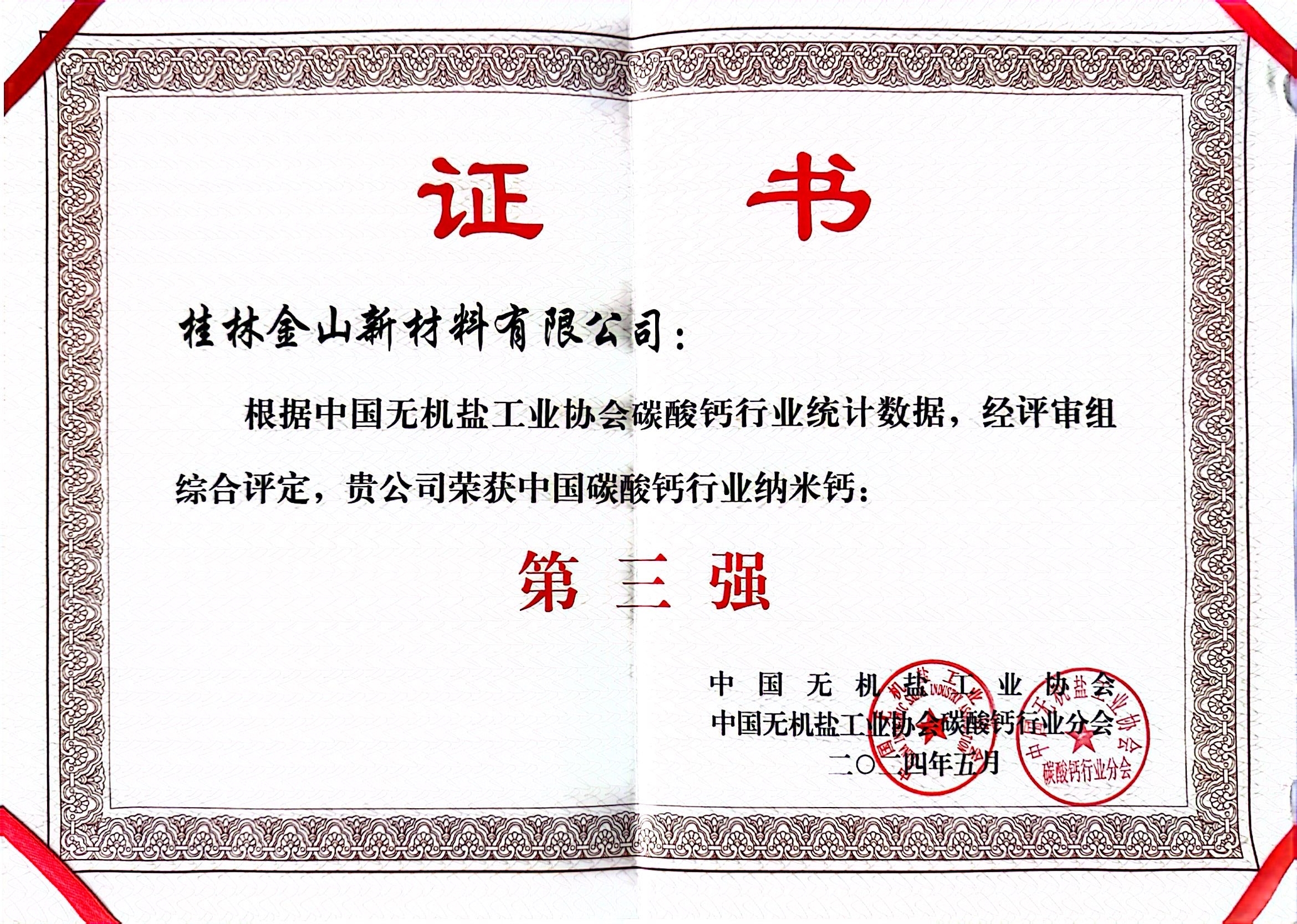 被中國(guó)無機(jī)鹽工業(yè)協(xié)會(huì)、中國(guó)無機(jī)鹽工業(yè)協(xié)會(huì)碳酸鈣行業(yè)分會(huì)授予“輕鈣第一強(qiáng)”、“納米鈣第四強(qiáng)”稱號(hào)